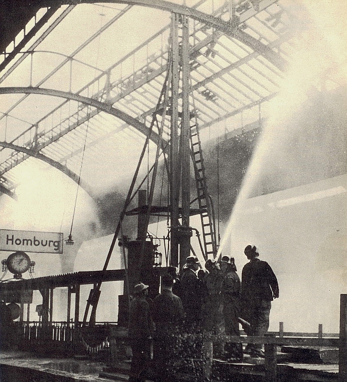 Bild: Löscharbeiten beim Brand der Bahnhofshalle Foto: 100 Jahre Obertaunuskreis (Stadtarchiv) Sommer 1961: Abbruch der Bahnhofshalle (Durch Funkenflug beim Schweißen brannte die Halle ab) |