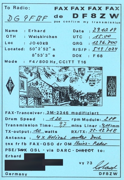23-cm-FAX-Verbindung in den Rodgau Sender: Transverter 23cm/2m, 1 W (Bausatz SSB-Electronic); Antenne: 55-Element-Yagi; FAX: Umgebaute Maschine 3M 2346 (von der Deutschen Bundespost ausgemustert) |