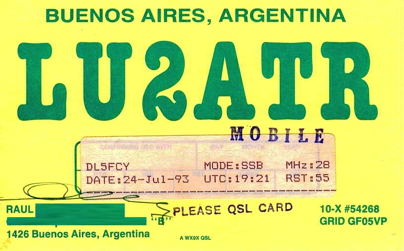 10-m-Verbindung mit Raul, der gerade mit seinem Auto (Ford Sierra) durch Buenos Aires fuhr. Sender: Yaesu FT 890, 100 W; Antenne: CB-Funk Antenne Sirtel 2000 an der Garagenrückwand, ca. 4 m über Grund |