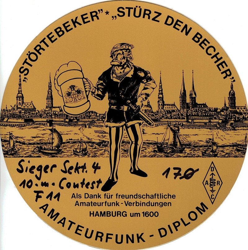 Sieg für F11 im 10-m-Contest Sektion 4 SWL (Störtebeker-Diplom) Empfänger: Sommerkamp SRG-8799 (baugleich mit YAESU FRG-8800) Antenne: ca. 35 m isolierte Litze innerhalb des Hauses (wird später noch mal gebraucht) |