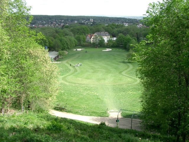 Röderwiesen Vom Müllplatz zum Golfplatz Start: P/H Sportzentrum NW (Stadtbus 6), P/H Usinger Weg (Stadtbus 6), P Lutherlinde Von der Bushaltestelle oder Parkplatz geht es zunächst am Stadion entlang. ln dieser Arena, das Herzstück des Sportzentrums Nord-West finden auch internationale Sportveranstaltungen statt. Das einsam stehende Haus scheint nicht besonders für Wohnzwecke geeignet, steht es doch unmittelbar an der Bundesstraße 456, einer sehr stark belasteden Verkehrsader, die eine wichtige Verbindung zwischen Vorder- und Hintertaunus darstellt. Wir erreichen den Weberpfad und die Karlsbrücke. Alsbald verlassen wir das Wäldchen halblinks; kurz darauf wählen wir den rechten Weg. Nun geht es etwas aufwärts; der ehemalige Müllberg (Monte Scherbelino) wurde renaturiert und wurde zu einem Golfplatz (10-Loch) umgebaut. ![]() Der Weg führt durch den Golfplatz; bitte nehmen Sie ein wenig Rücksicht auf die Golfspieler! Heben Sie bitte keine Golfbälle auf! Jetzt geht es rechts abwärts und wir erreichen wieder den Weberpfad. Auf der linken Seite entdecken wir einen dreieckigen Grenzstein mit der Aufschrift LH K N.I. bzw. LH G N.20. In Höhe des Heidehof kreuzen wir den Hammelhansweg. Einige Meter rechts im Wald sehen wir einen weiteren Grenzstein: Er hat die Aufschrift St HB 43, rechts "44", links "1821" und auf der Rückseite LH G I. Etwas weiter erinnert auf der linken Seite ein Denkmal an Georg Stuller, einen 19-jährigen Soldaten, der im 2. Weltkrieg gefallen ist. "Er ruht in Belgischer Erde" heißt es dort. Schließlich erreichen wir eine Lichtung und gehen nach links unter der Hochspannungsleitung abwärts. Hier bietet sich ein schöner Ausblick auf Bad Homburg mit dem Weißen Turm. Schon bald sind wir wieder auf dem Hammelhansweg. Bei klarem Wetter ist die Silhouette von Frankfurt mit dem Fernmeldeturm zu sehen. Ein Schild des Vereins für Vogelfreunde Bad Homburg 1958 weist auf die Bedeutung dieses Gebietes für die Vogelwelt hin. Nach einigen Metern ist rechts ein Damm zu erkennen: es ist der ehemalige Bahndamm, auf dem die Homburger Straßenbahn zur Saalburg fuhr. Wir gehen nun nach links in das Neubaugebiet "Im Birnbaumfeld". Der Fußweg zweigt bald nach links ab. Wir erreichen die Straße, gehen aber gleich die nächste Möglichkeit rechts. Hier bieten sich noch einige schöne Einblicke auf den Golfplatz. Bald erreichen wir die Dornholzhäuser Straße. Wir bleiben auf dem Pfad auf der linken Seite und sind bald am Clubhaus. Der Homburger Golf Club wurde 1899 gegründet und ist der älteste Golfclub in Deutschland. Über den "Uhusteg", eine kleine hölzerne Brücke queren wir den Kirdorfer Bach und sind wieder auf dem Hinweg angelangt. Unter der Karlsbrücke durch sind wir nach wenigen Metern wieder am Parkplatz bzw. Bushaltestelle. Zuvor bietet sich die Schützenklause an, eine kleine Schlussrast einzulegen (ab 16 Uhr, am Wochenende ab 11 Uhr). |